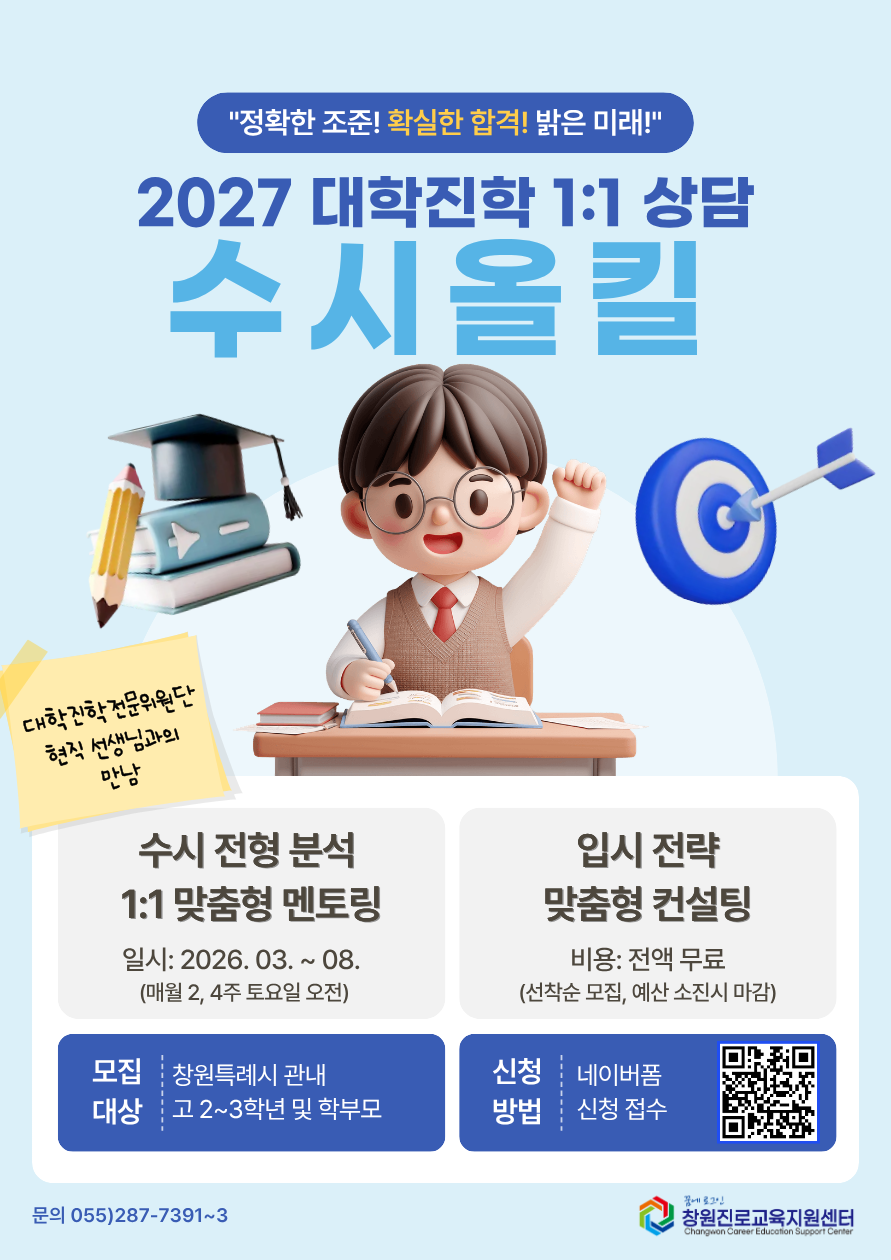 아래 네이버폼 링크 신청 바랍니다! 2027학년도 대학진학 입시전략 1:1 상담 「수 시 올 킬」 급변하는 대입전형에 능동적으로 대처할 수 있도록 학부모와 학생들에게 최신의!! 최선의!! 진로·진학 전문 정보를 제공합니다 ○ 운영 개요 : 경남교육청 대학진학전문위원단과 창원진로교육지원센터가 연계·협력하여 운영 입시전략 '멘토링 1:1 상담' 운영 □ 일 시 : 2026년 03월 ~ 08월 (매월 2, 4주 토요일 오전) □ 대 상 : 관내 고등학교 2~3학년 및 학부모 (고3 우선) □ 장 소 : 창원진로교육지원센터 □ 내 용 : 대학입시 수시전형 분석 및 1:1 입시 컨설팅 □ 신청 방법 : 아래 링크 또는 QR 접속 후 네이버폼 접수 □ 운영 내용 - ·대입준비 중인 고등학생들의 수시전형 계획 분석과 맞춤형 컨설팅 - 1:1 멘토링 상담 - 학생생활기록부 및 모의고사성적표 분석 ※상세 일정은 변경될 수 있습니다