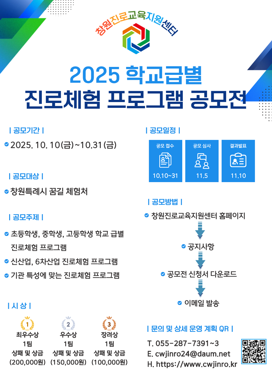 【 2025 학교급별 진로체험 프로그램 공모전 개최 안내문 】창원진로교육지원센터에서는 관내 학생들을 위한 우수 진로체험 프로그램을 발굴하고 지원하기 위해 다음과 같이 「2025 학교급별 진로체험 프로그램 공모전」을 개최합니다. 역량 있는 체험처의 많은 관심과 참여를 바랍니다. 1. 공모 개요