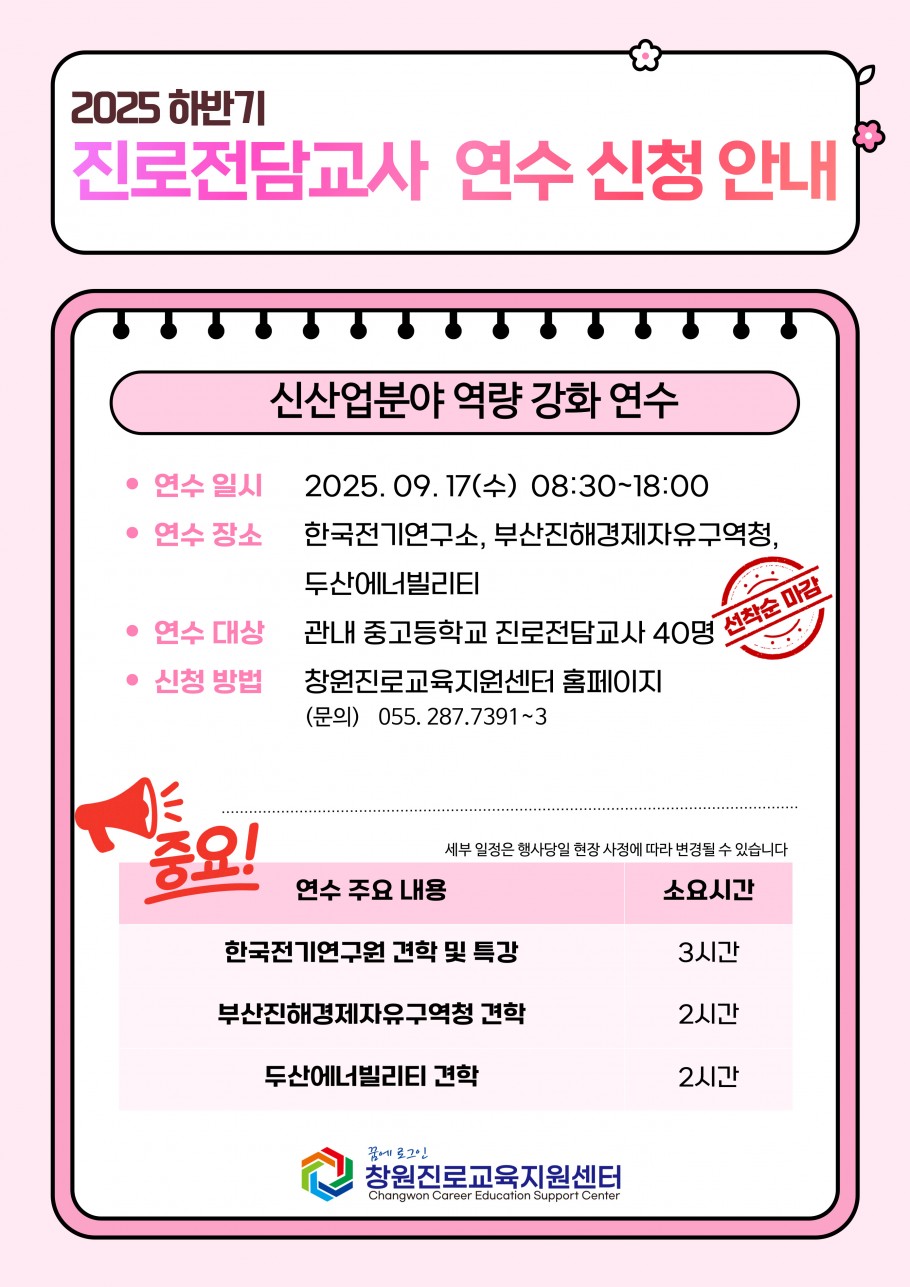 2025 하반기 진로전담교사 연수 안내 일 시 : 2025년 09월 17일 (수) 08:30 ~ 18:00 대 상 : 창원 관내 중고등학교 진로전담교사 40명 (선착순 모집) 장 소 : 한국전기연구소, 부산진해경제자유구역청, 두산에너빌리티 내 용 : - 미래사회에 활용될 신산업 중심의 연구소와 기업체에서 강연을 듣고 견학을 통해 미래사회에 대한 이해와 산업계의 준비 현황을 이해한다. - 한국전기연구소에서 전기가 우리 사회에 어떤 역할을 하는지 이해하고 산업적으로 어떻게 활용되는지 알게 된다. - 두산에너빌리티 신산업 에너지에 대한 이해도를 높인다. - 음식 문화 체험을 통해 식생활에서 음식의 중요성과 다양한 음식 문화를 체험한다. 세부일정